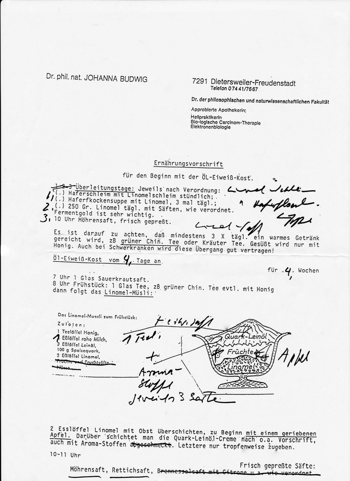 Paní Dr. Johanna Budwig (www.dr-johanna-budwig.cz) se dlouhá desetiletí věnovala s velkým úspěchem pacientům s rakovinou a její olejovo-bílkovinová strava byla vždy základem léčebné terapie. Ne nadarmo byla Dr. Budwig sedmkrát nominována na Nobelovu cenu.